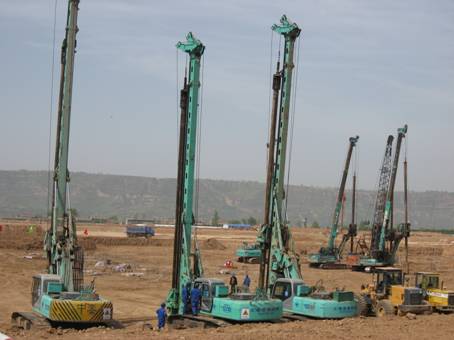 我公司共完成了5#機組配套的主廠房、煤倉間、主變、升壓站架構(gòu)、鍋爐補給水間、爐前兩機公用其他設(shè)施地基處理。地基處理采用干作業(yè)旋挖鉆孔灌注樁,共完成φ900灌注樁727根,φ800灌注樁584根,φ650灌注樁246根,混凝土19573.5m3。