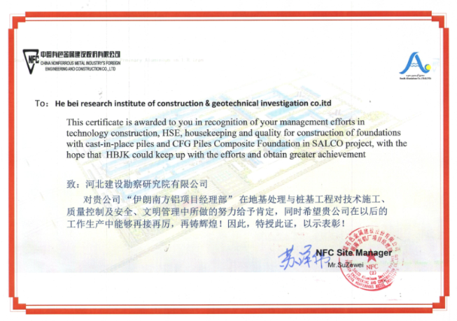 我公司承建的伊朗南方鋁項(xiàng)目,自開(kāi)工以來(lái)精心策劃、有效組織、認(rèn)真施工、積極與業(yè)主配合,保質(zhì)保量完成了施工進(jìn)度。在施工過(guò)程中業(yè)主對(duì)我公司伊朗南方鋁項(xiàng)目部在技術(shù)施工、質(zhì)量控制及安全、文明管理中所做的努力給予了肯定,并授予表彰證書。