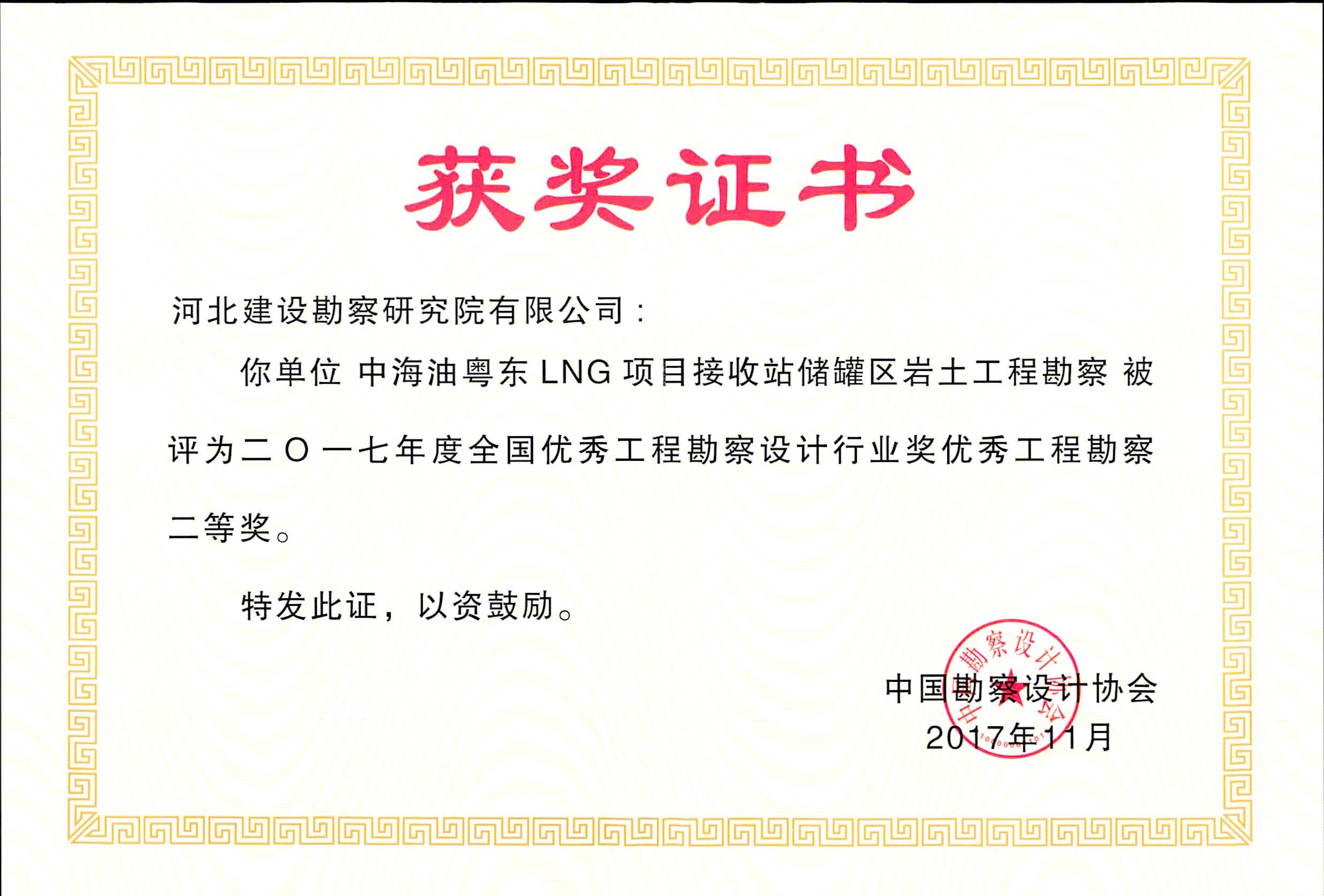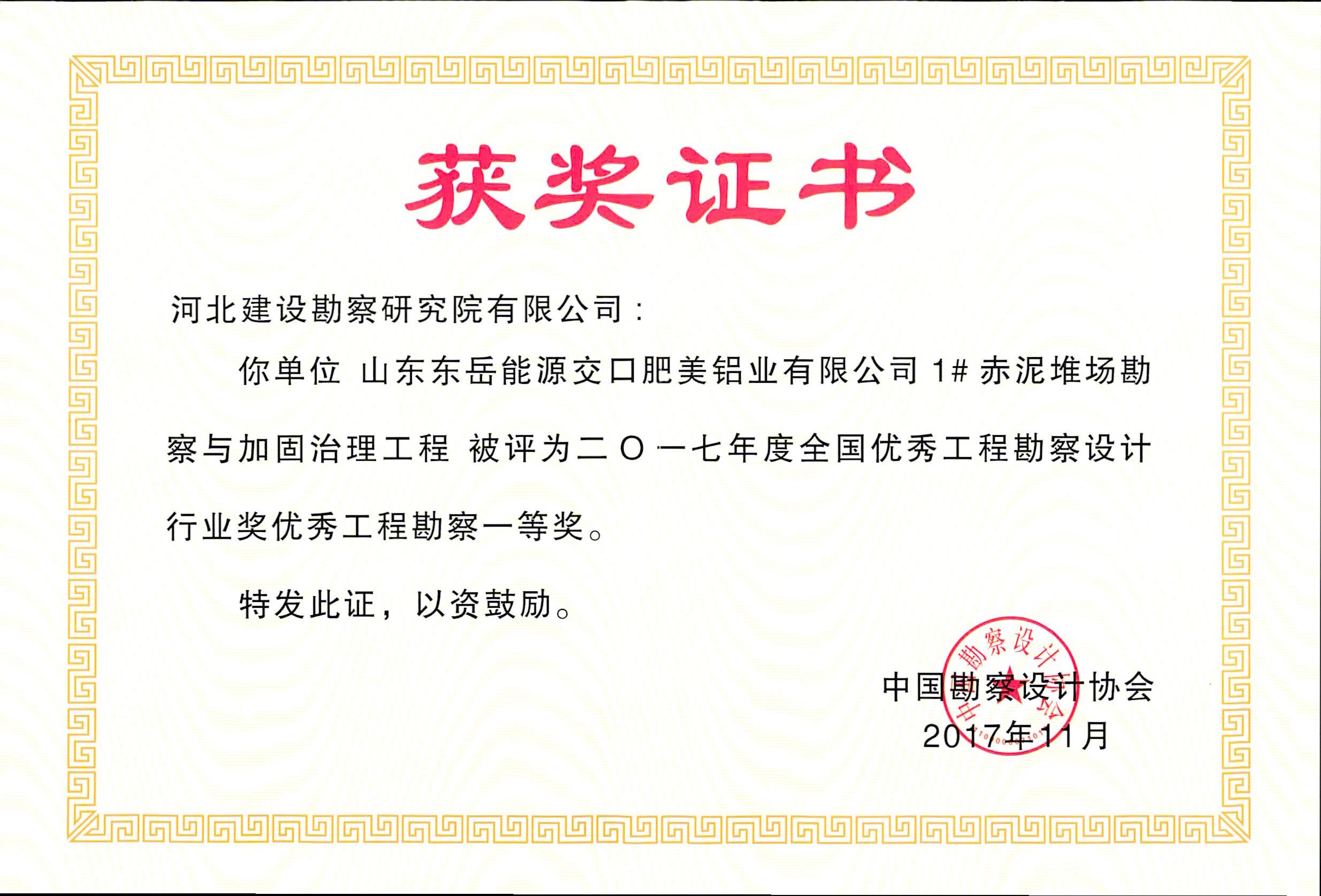 根據(jù)中國(guó)勘察設(shè)計(jì)協(xié)會(huì)2017年11月29日發(fā)布的中設(shè)協(xié)字【2017】85號(hào)文件《關(guān)于公布2017年度全國(guó)優(yōu)秀工程勘察設(shè)計(jì)行業(yè)獎(jiǎng)評(píng)選結(jié)果的通知》,我公司兩項(xiàng)工程獲優(yōu)秀工程勘察獎(jiǎng)。其中,山東東岳能源交口肥美鋁業(yè)有限公司1#赤泥堆場(chǎng)勘察與加固治理工程榮獲優(yōu)秀工程勘察一等獎(jiǎng),中海油粵東LNG項(xiàng)目接收站儲(chǔ)罐區(qū)巖土工程勘察榮獲優(yōu)秀工程勘察二等獎(jiǎng)。