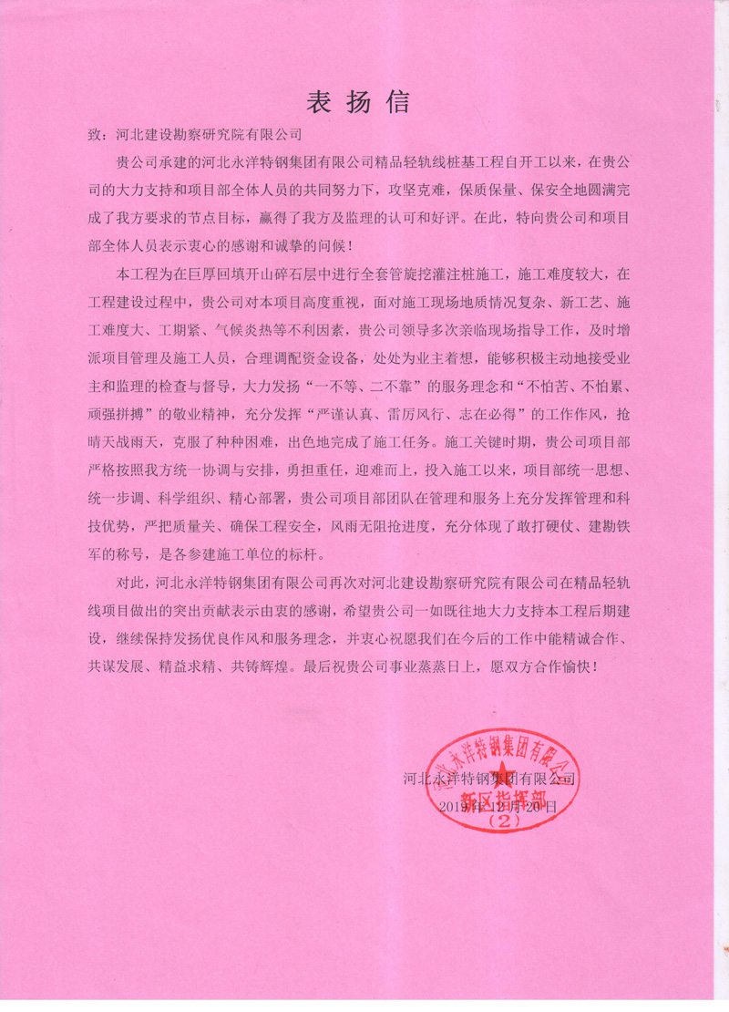 近日,我公司河北永洋特鋼集團有限公司精品輕軌線樁基工程收到河北永洋特鋼集團有限公司的表揚信。項目部全體員工大力發(fā)揚“一不等、二不靠”的服務理念和“不怕苦、不怕累、頑強拼搏”的敬業(yè)精神,充分發(fā)揮“嚴謹認真、雷厲風行、志在必得”的工作作風,搶晴天戰(zhàn)雨天,克服了種種困難,出色地完成了施工任務。甲方對項目部全體員工的辛勤付出,給予了高度認可和評價,并為后續(xù)雙方的合作奠定了良好基礎(chǔ)。并衷心祝愿我們在今后的工作中能精誠合作、共謀發(fā)展、精益求精、共鑄輝煌。