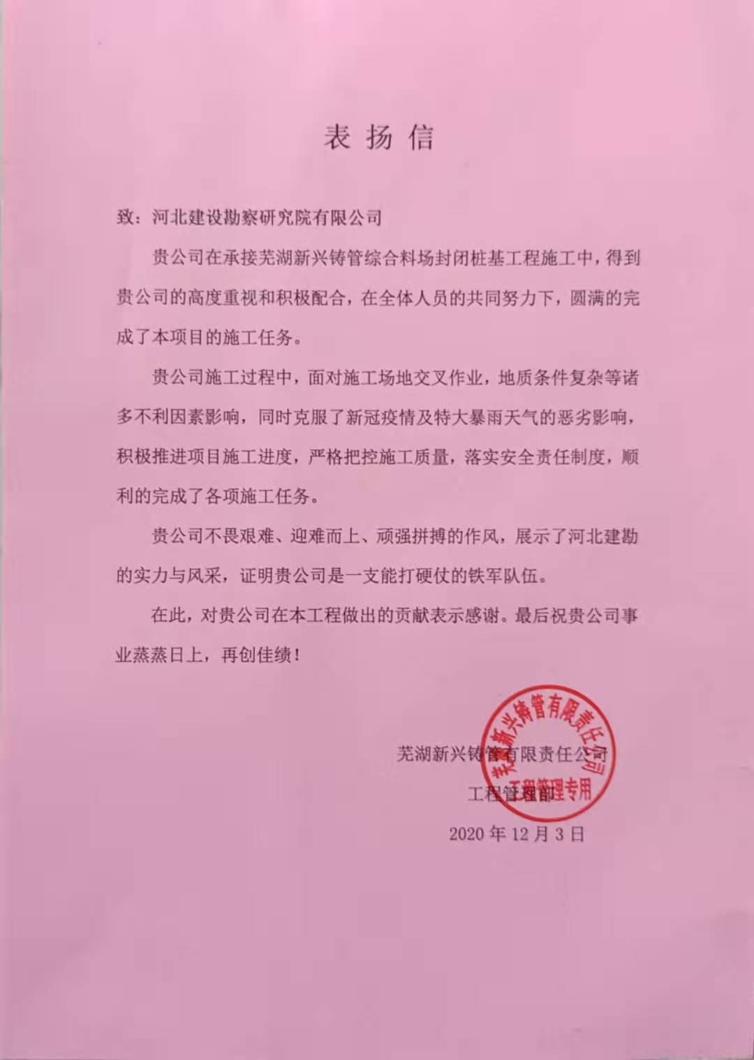 近日,公司收到蕪湖新興鑄管有限責(zé)任公司發(fā)來的表?yè)P(yáng)信,對(duì)我公司在蕪湖新興鑄管綜合料場(chǎng)封閉樁基施工過程中,面對(duì)施工場(chǎng)地交叉作業(yè),地質(zhì)條件復(fù)雜等諸多不利因素,同時(shí)克服了新冠疫情及特大暴雨天氣的惡劣影響,順利完成了各項(xiàng)施工任務(wù),給予了充分的肯定,并表示感謝!