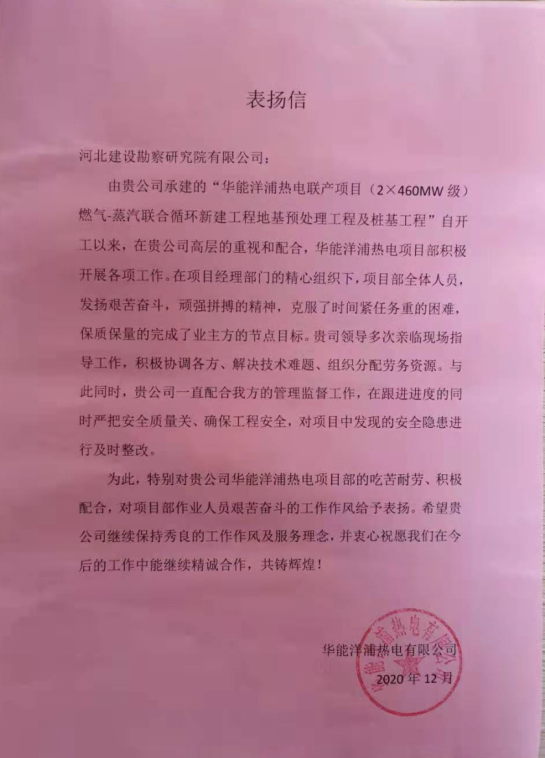 華能洋浦熱電聯(lián)產(chǎn)項(xiàng)目(2×460MW級(jí))燃?xì)?蒸汽聯(lián)合循環(huán)新建工程地基預(yù)處理工程及樁基工程自開工以來,積極開展各項(xiàng)工作,精心組織,克服了時(shí)間緊任務(wù)重的困難,保質(zhì)保量完成了節(jié)點(diǎn)目標(biāo)。特對(duì)項(xiàng)目部的吃苦耐勞、積極配合,對(duì)項(xiàng)目部作業(yè)人員艱苦奮斗的工作作風(fēng)給予表揚(yáng)。