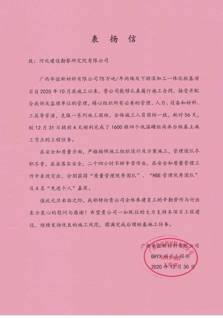 廣西華誼新材料有限公司75萬(wàn)噸/年丙烯及下游深加工一體化樁基項(xiàng)目部,近日收到來自甲方的表?yè)P(yáng)信及嘉獎(jiǎng)。