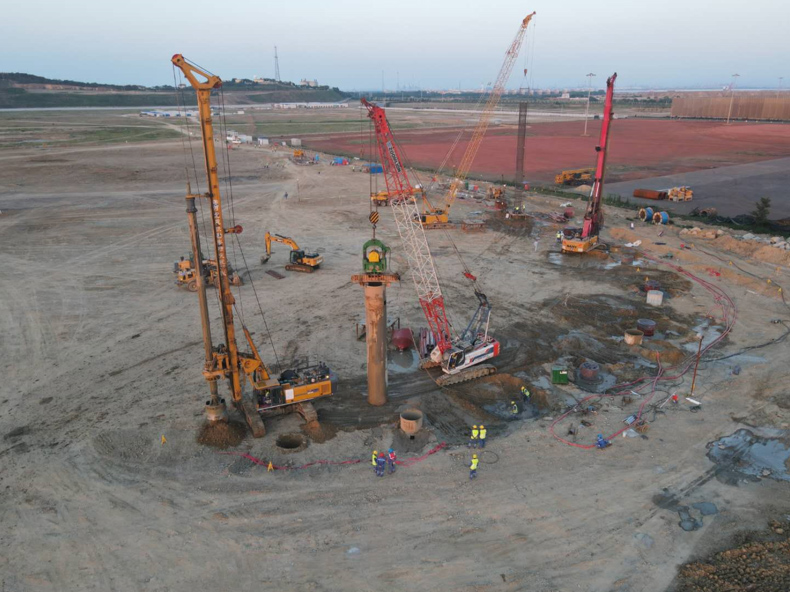 中海油龍口南山LNG接收站一期工程項目(以下簡稱“龍口LNG”)站址位于山東省龍口市煙臺港龍口港區(qū)作業(yè)區(qū)規(guī)劃LNG專區(qū),本工程于2020年4月15日開工,2021年4月1日竣工,歷時351天。完成的主要工作量為T-0201、T-0202儲罐樁基工程相關(guān)的全部工作,包含:泥漿護壁成孔一體化灌注樁(樁數(shù)720根,直徑1.5m,樁長為9.86m~41.8m不等,混凝土等級C40P8)40765.71m³、鋼筋籠3564.846t、入巖增加費10892.03m³、聲測管(SCG50-1)8601.59m、碎石樁(樁徑1m,樁長8m,樁數(shù)3497根)21972.3m³、旋挖棄土外運39358.86m³、預(yù)留隔震墊安裝孔洞(單樁孔洞數(shù)量10個,孔洞長度0.9m,孔徑80mm)720套,超前鉆5247.5m。