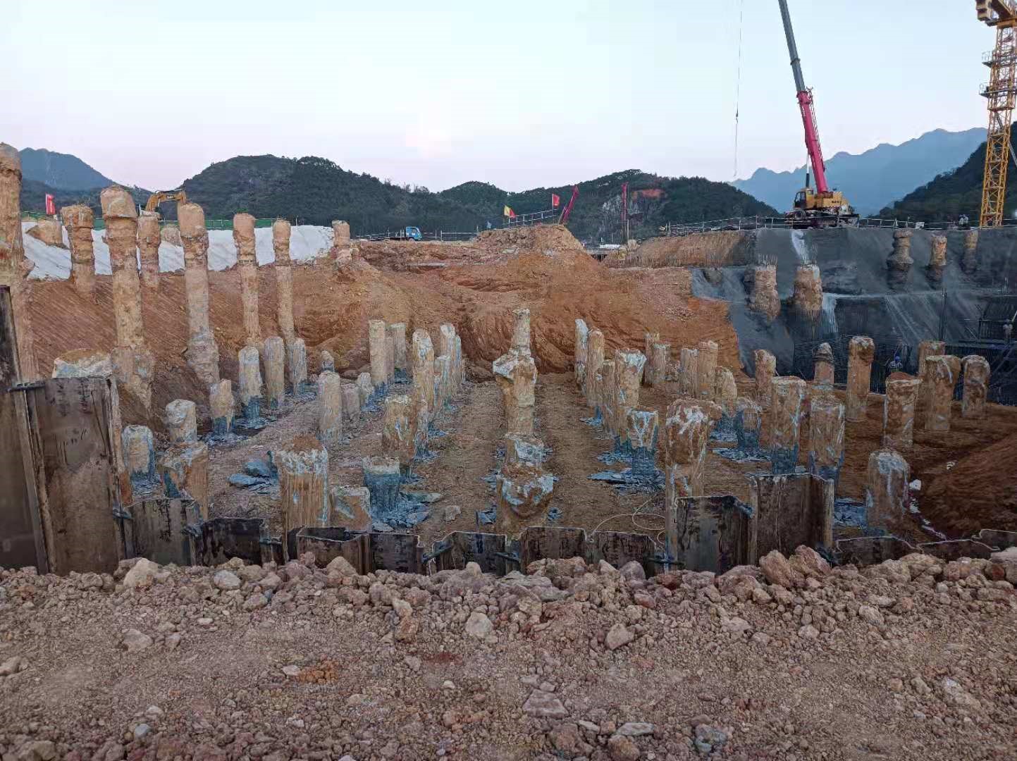 本工程于2021年04月10日開工,2022年01月27日現(xiàn)場(chǎng)樁基施工完工,工程施工期間累計(jì)投入施工人員200余人和大功率旋挖鉆機(jī)10臺(tái)以及相關(guān)匹配的機(jī)械設(shè)備??朔擞昙?、高溫和地質(zhì)條件復(fù)雜等諸多不利因素,累計(jì)完成鉆孔灌注樁1857根,處理溶洞約31000m³(含回填片石、水泥、C20砼及注漿和遇溶洞樁超灌混土量)。