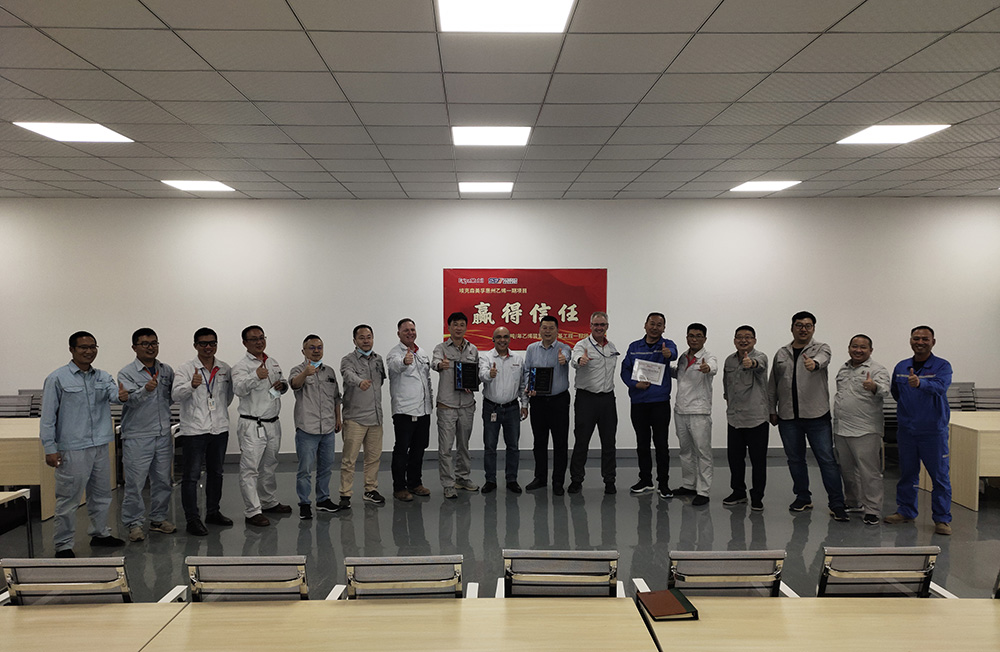 5月30日,??松梨冢ɑ葜荩┗び邢薰菊匍_2022年工作表彰大會,我公司參建的惠州美孚乙烯一期樁基工程項目部,在參建的30余家施工單位中以優(yōu)異的成績,榮獲“優(yōu)秀管理團隊”稱號,生產(chǎn)設(shè)備科科長兼項目經(jīng)理武坤倫榮獲 “卓越領(lǐng)導(dǎo)力”個人榮譽證書,項目部每位員工都收到了業(yè)主頒發(fā)的獎品。