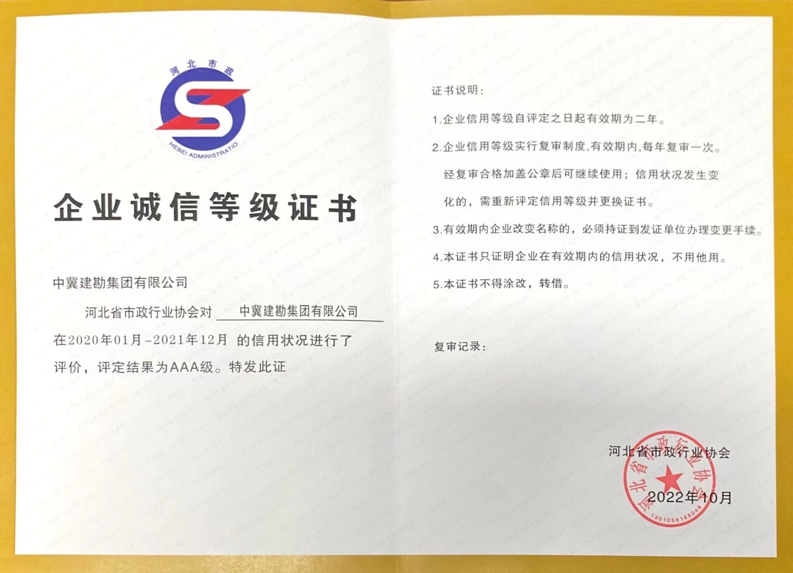 公司獲得“2021年度河北省市政行業(yè)AAA級(jí)誠(chéng)信企業(yè)”榮譽(yù)稱(chēng)號(hào)