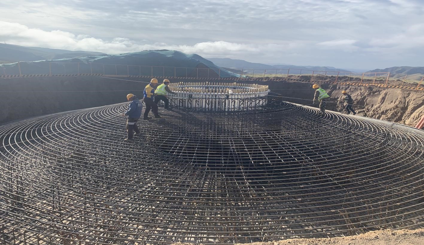 本項(xiàng)目采用了可更換基礎(chǔ)預(yù)應(yīng)力錨栓組件,解決了傳統(tǒng)的埋入式基礎(chǔ)環(huán),預(yù)應(yīng)力錨栓抗疲勞性能差,應(yīng)力不均勻,不方便后期錨栓組件維修保養(yǎng)等問(wèn)題。由于每個(gè)風(fēng)機(jī)基礎(chǔ)混凝土用量較大,屬于大體積混凝土澆筑,為防止產(chǎn)生混凝土裂縫,我們嚴(yán)格控制混凝土澆筑過(guò)程中的溫度和混凝土養(yǎng)護(hù)過(guò)程中內(nèi)外部溫差。同時(shí),預(yù)應(yīng)力錨栓組件、錨栓的垂直度和錨板的水平度控制是直接影響風(fēng)機(jī)塔筒穩(wěn)定性的關(guān)鍵因素,施工難度大。