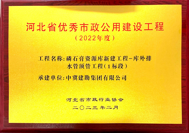 近日,河北省市政行業(yè)協(xié)會(huì)發(fā)布消息,經(jīng)過(guò)審核申報(bào)材料、查驗(yàn)施工現(xiàn)場(chǎng)、專(zhuān)家綜合評(píng)議,我公司市政工程項(xiàng)目“磷石膏資源庫(kù)新建工程——庫(kù)外水管頂管工程(1標(biāo)段)”被評(píng)為河北省優(yōu)秀市政公用建設(shè)工程,并為項(xiàng)目經(jīng)理高立康同志頒發(fā)了榮譽(yù)證書(shū)。