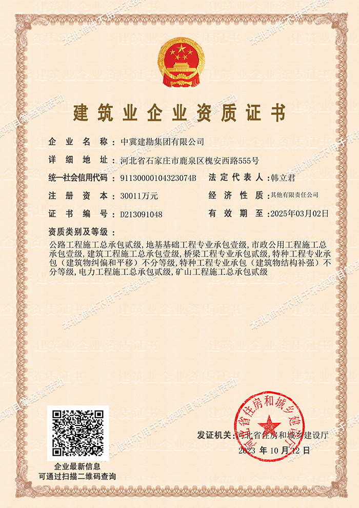 為拓展公司業(yè)務(wù)范圍,在公司領(lǐng)導(dǎo)的精心策劃下,經(jīng)過(guò)安全生產(chǎn)部的不懈努力,集團(tuán)公司于2023年10月12日經(jīng)河北省交通廳、河北省住建廳審核批準(zhǔn),成功取得了公路工程施工總承包貳級(jí)資質(zhì),該資質(zhì)的取得將為集團(tuán)公司拓展縣、鄉(xiāng)、村公路工程業(yè)務(wù)提供了先決條件,為增強(qiáng)地方市場(chǎng)的開(kāi)拓能力、提高地方市場(chǎng)競(jìng)爭(zhēng)力提供有力支撐,將在助力集團(tuán)公司高質(zhì)量發(fā)展、升級(jí)轉(zhuǎn)型上貢獻(xiàn)更大力量。