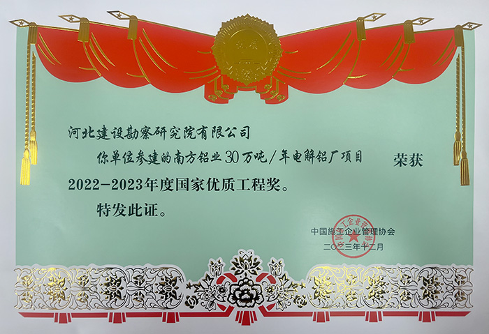 近日,根據(jù)國家優(yōu)質(zhì)工程獎(jiǎng)評選辦法,我公司參建的《南方鋁業(yè)30萬噸/年電解鋁廠》項(xiàng)目,榮獲2022-2023年度國家優(yōu)質(zhì)工程獎(jiǎng)。