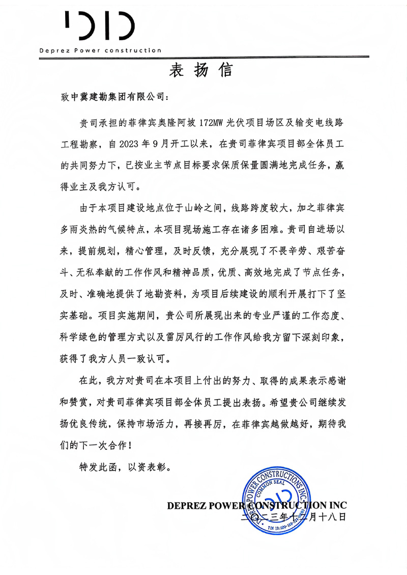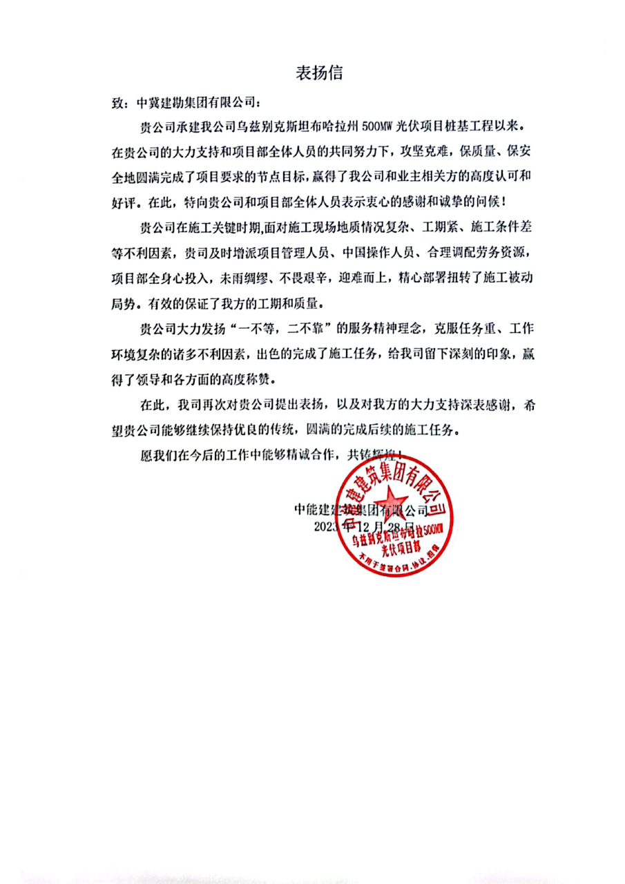 中能建建筑集團有限公司發(fā)來的表揚信,對在烏茲別克斯坦布哈拉州500MW光伏項目建設過程中,項目部全體人員發(fā)揚“一不等,二不靠”的服務理念,克服工作環(huán)境和地質復雜等困難,在公司的大力支持和項目全體人員的共同努力下,圓滿完成了項目要求的節(jié)點目標,特向我公司表示衷心的感謝和誠摯的問候,愿今后繼續(xù)精誠合作,共鑄輝煌。