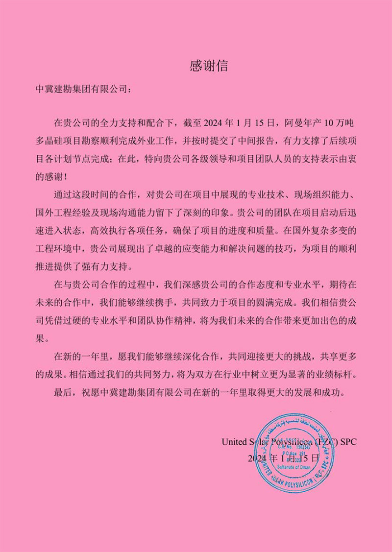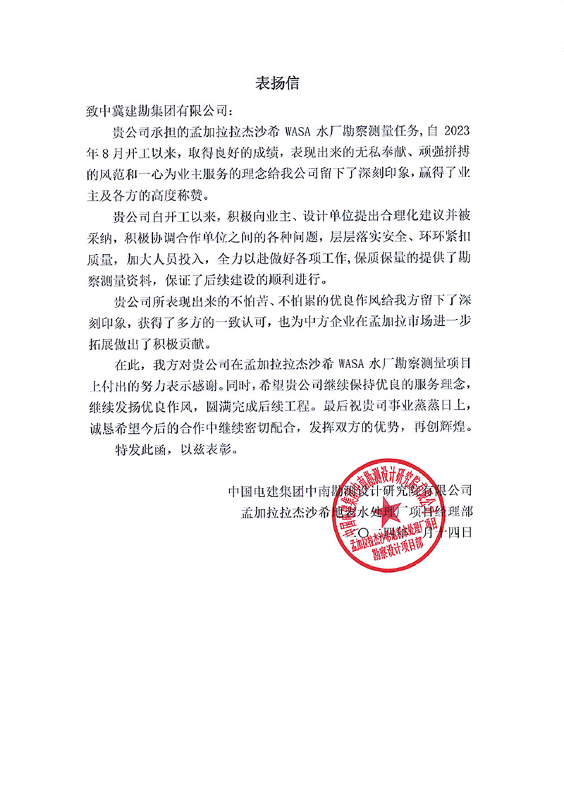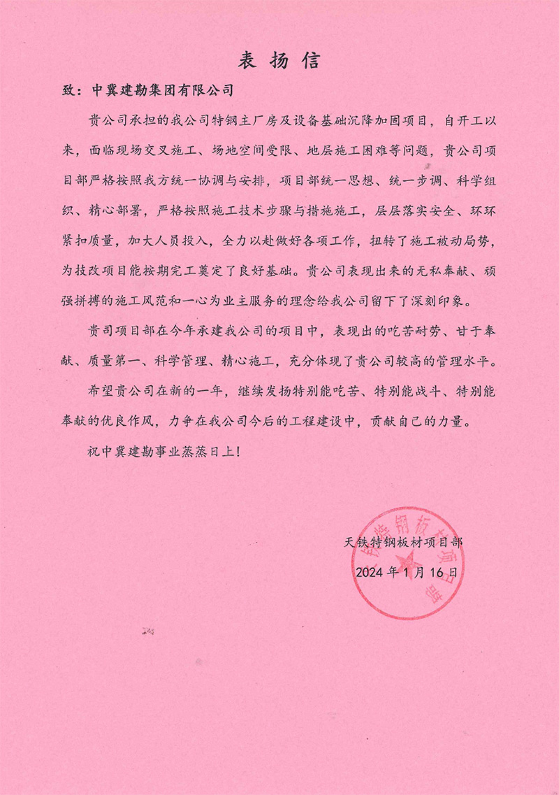 近日,集團公司陸續(xù)收到國內外項目業(yè)主發(fā)來的表揚信,信中對我公司的項目管理、團隊建設、安全文明施工、技術質量管控等,給予了高度評價,同時送上了新年一年的祝福。