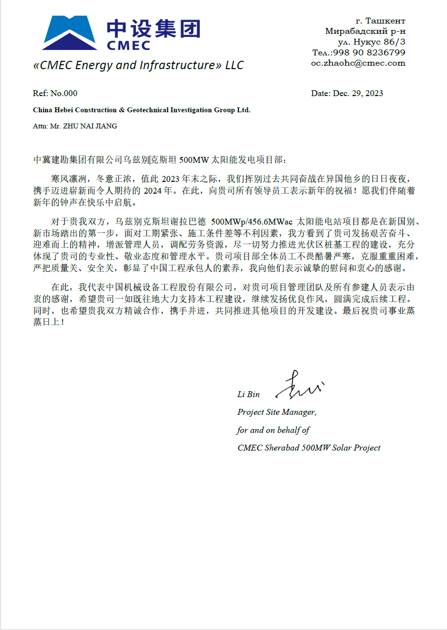 中國機械設備工程股份有限公司發(fā)來的表揚信,對在烏茲別克斯坦謝拉巴德 500MWp/456.6MWac 太陽能電站項目建設過程中,項目全體人員克服諸多不利因素,發(fā)揚建勘精神,盡一切努力推進工程建設,以及公司的專業(yè)性、敬業(yè)態(tài)度和管理水平給予了高度評價。同時,對項目管理團隊及所有參建人員表示由衷的感謝,并希望雙方精誠合作,攜手并進,共同推進其他項目的開發(fā)建設。
