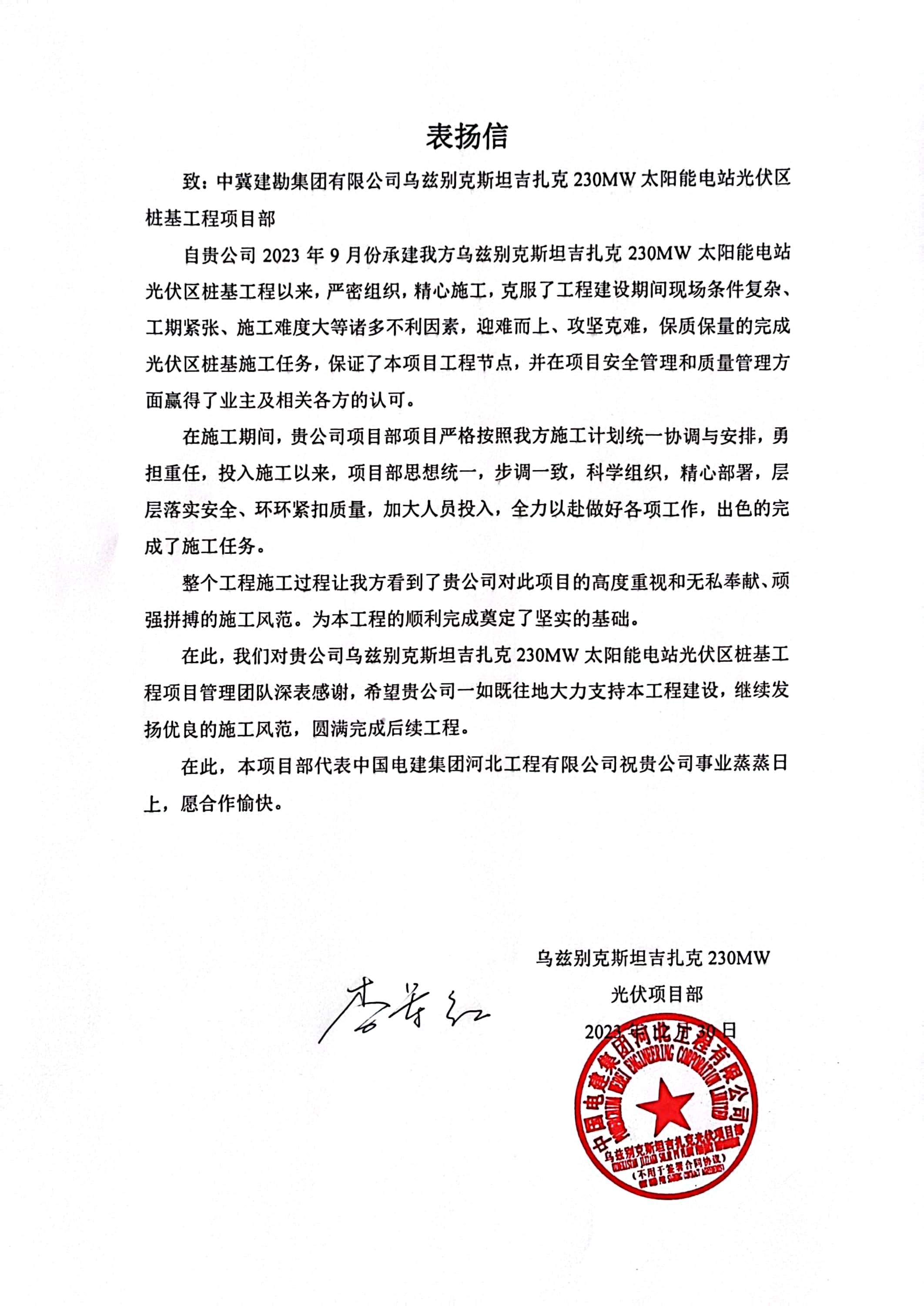 中國電建集團河北工程有限公司發(fā)來的表揚信,對在烏茲別克斯坦吉扎克230MW太陽能電站光伏項目施工期間,項目部思想統(tǒng)一,科學組織,精心部署,層層落實安全、環(huán)環(huán)緊扣質量,全力以赴做好各項工作的奮斗精神,給予了高度評價和感謝。