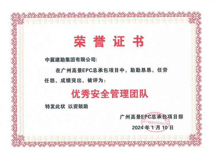 中國電子系統(tǒng)工程第四建設有限公司發(fā)來的表揚信,對我公司在廣州高景太陽能科技有限公司高效光伏組件項目建設過程中,公司的大力配合和項目部全體人員的共同努力下,安全管理體系覆蓋到位,質量保證措施到位,嚴格把控質量、安全關,出色完成了施工任務,特向我公司各級領導、全體參建員工表示衷心的感謝,并授予“優(yōu)秀安全管理團隊”和“優(yōu)秀資料包商”榮譽。