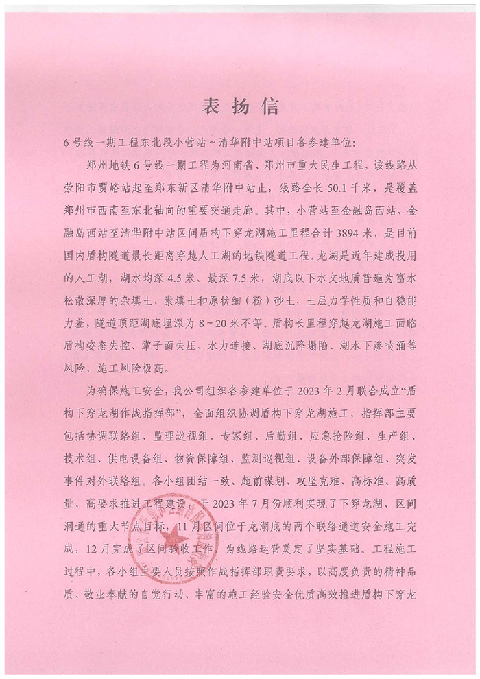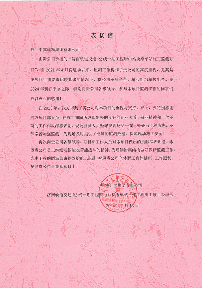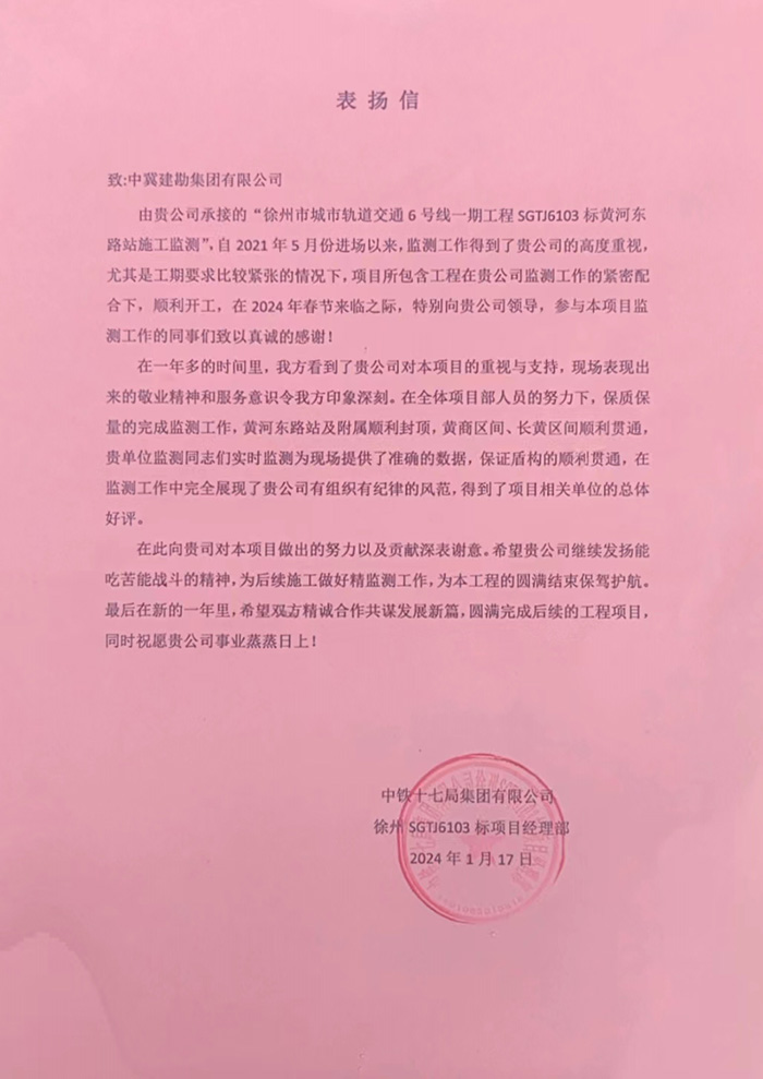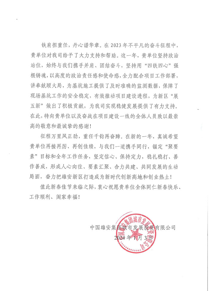 近期,公司陸續(xù)收到中國雄安集團城市發(fā)展投資有限公司、河北雄安軌道快線有限責任公司、中國雄安集團生態(tài)建設(shè)投資有限公司、中鐵五局、中鐵十七局、鄭州地鐵集團、內(nèi)蒙古大唐國際克什克騰旗煤制天然氣電廠、大唐內(nèi)蒙古多倫電廠等業(yè)主單位發(fā)來的感謝信。我公司認真負責、敢打能打硬仗的工作態(tài)度、頑強拼搏的施工風范和一心為業(yè)主服務(wù)的理念,贏得了業(yè)主的高度認可和贊揚,特發(fā)來感謝信深表感謝!