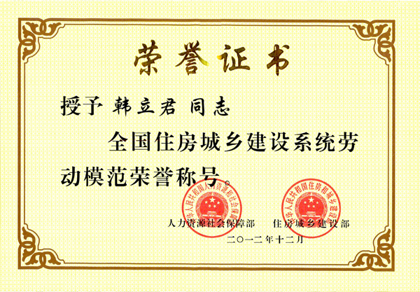 為進(jìn)一步激勵(lì)全國(guó)住房城鄉(xiāng)建設(shè)系統(tǒng)廣大干部職工的積極性、主動(dòng)性、創(chuàng)造性,促進(jìn)住房城鄉(xiāng)建設(shè)事業(yè)健康持續(xù)發(fā)展,人力資源和社會(huì)保障部、住房和城鄉(xiāng)建設(shè)部在全國(guó)住房城鄉(xiāng)建設(shè)系統(tǒng)內(nèi),開展了先進(jìn)集體和先進(jìn)個(gè)人的評(píng)選活動(dòng)。經(jīng)過(guò)公司及各級(jí)人力資源社會(huì)保障部門、住房城鄉(xiāng)建設(shè)管理部門的逐級(jí)推薦,報(bào)評(píng)選表彰工作領(lǐng)導(dǎo)小組審查通過(guò)后,最后由住房城鄉(xiāng)建設(shè)部黨組和人力資源社會(huì)保障部審定,評(píng)選出先進(jìn)集體200個(gè),先進(jìn)工作者450名,勞動(dòng)模范350名。其中,我公司董事長(zhǎng)韓立君同志榮獲全國(guó)住房城鄉(xiāng)建設(shè)系統(tǒng)勞動(dòng)模范稱號(hào)。